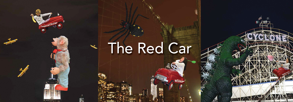 The Red Car uses photographs of iconic New York City landmarks as backdrops.